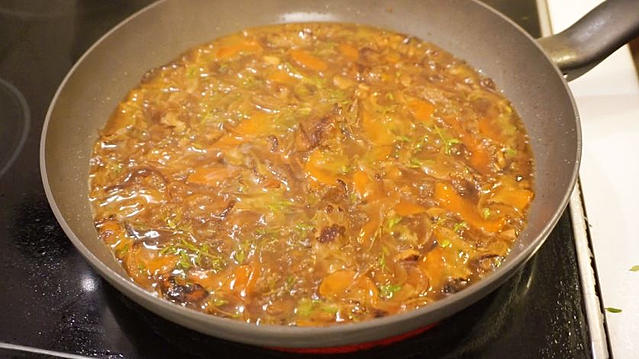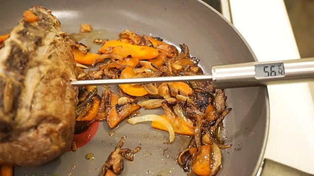 4.野菜を炒めその上に仔羊を乗せフライパンローストします。蓋が無かったのでアルミで代用しましたが、水分が蒸発しやすく野菜が焦げやすいのであらかじめ水を加えたほうが良いでしょう。蓋をする前の温度は35℃