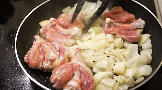 鶏肉を少し焼いたら、玉ねぎを加え一緒に炒めます。