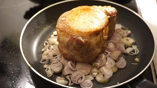 4.フライパンの脂を捨てエシャロットを軽く炒めます。その上に豚肉を乗せ蓋をし蒸し焼きにしていきます。火加減は弱火。フライパンの蓋が無い場合はアルミホイルで蓋を作りますが、蒸気の漏れが激しいので、エシャロットを焦がさないように水をフライパンに入れながら中心温度60℃を目指します。