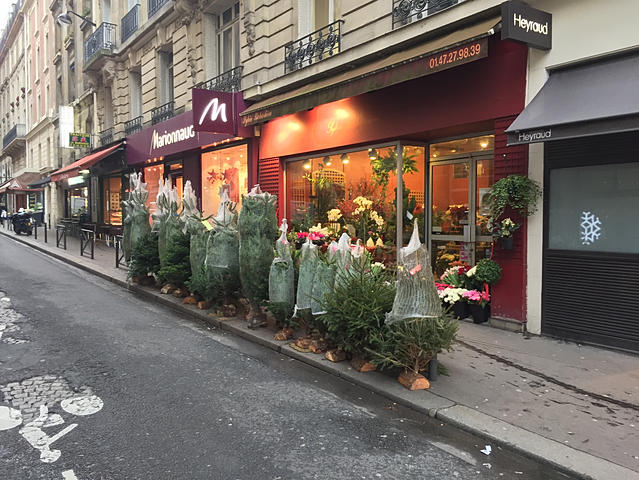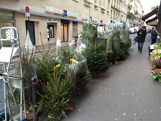 フランスでクリスマスになるとよく目にするもの、スーパーなら牡蠣、フォアグラ、シャンパン。パン屋ケーキ屋ならブッシュドノエル。花屋ならクリスマスツリー用モミの木。フランスでクリスマスツリーは本物のモミの木を買って家に飾る習慣があります。
